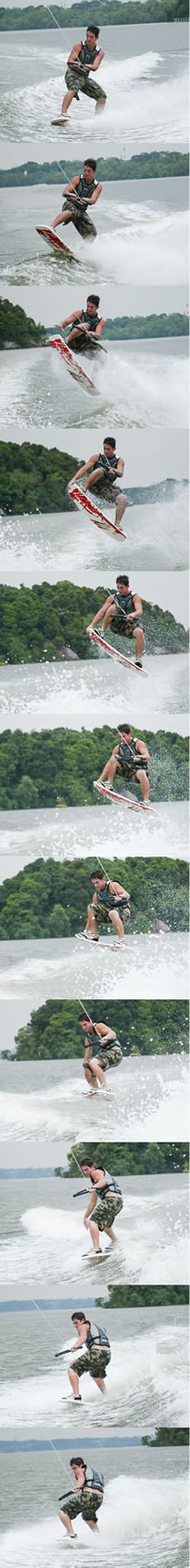 – Once as you have popped your board off the water, suck up your knees, push your back leg forward and pull your front leg backward while keeping your feet on the board.